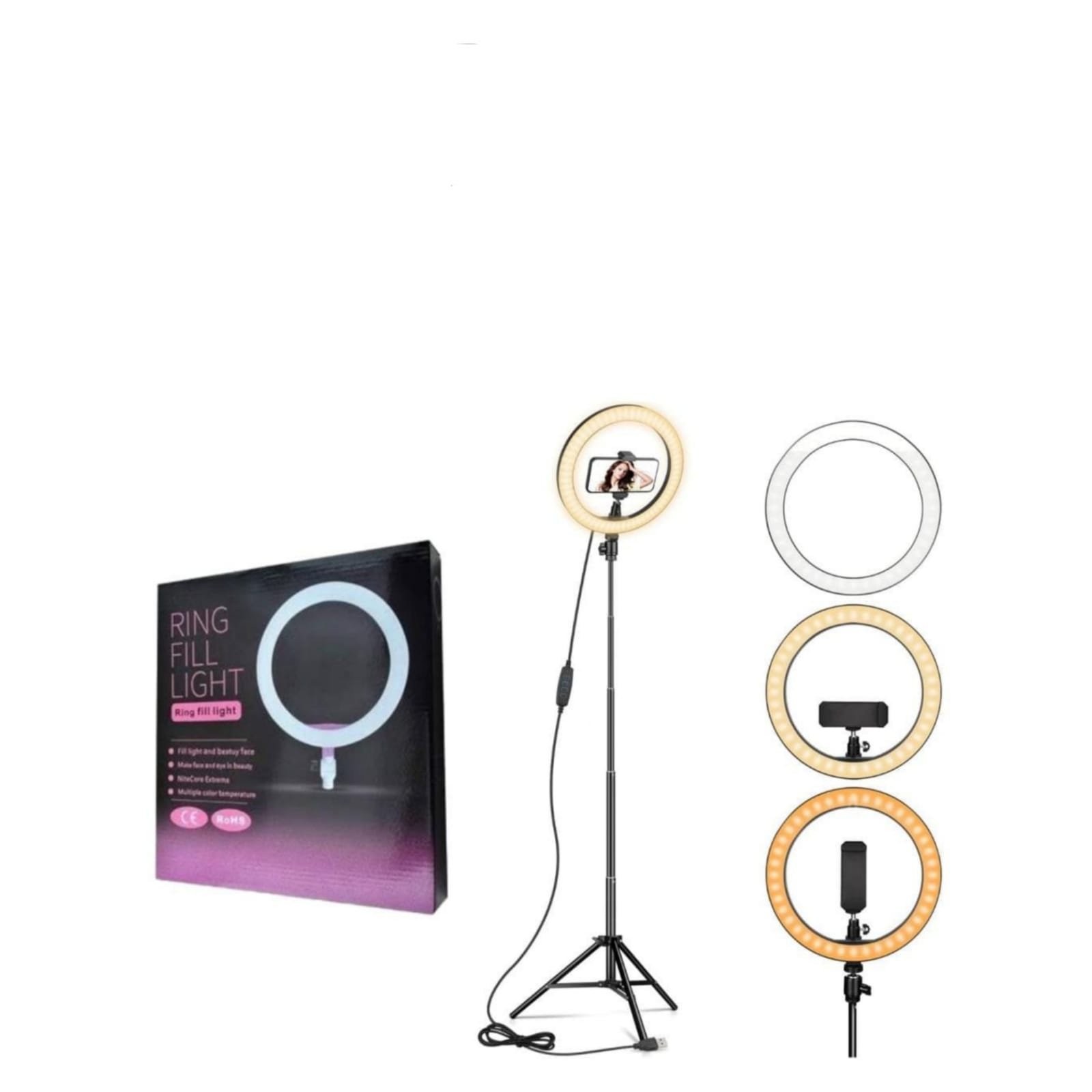 Aro de luz de 10″ quiere decir 26cm cuenta con 3 tonos luz fria, luz neutra y luz calida ademas tiene soporte para el celular
