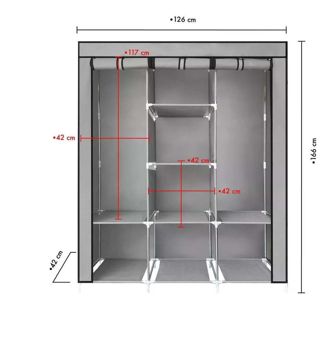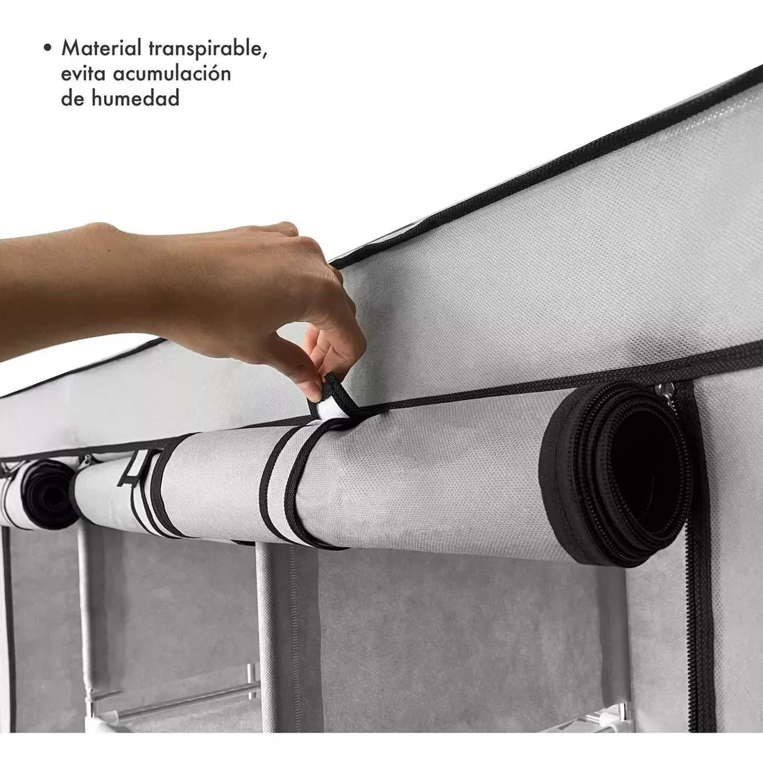 Closet a base de tubos de aluminio, tela ecológica y conectores de plástico; su peso máximo es de 30 kg de peso y su altura es de 165 cm, ideal para colocar todo tu guardarropa en un mismo lugar.