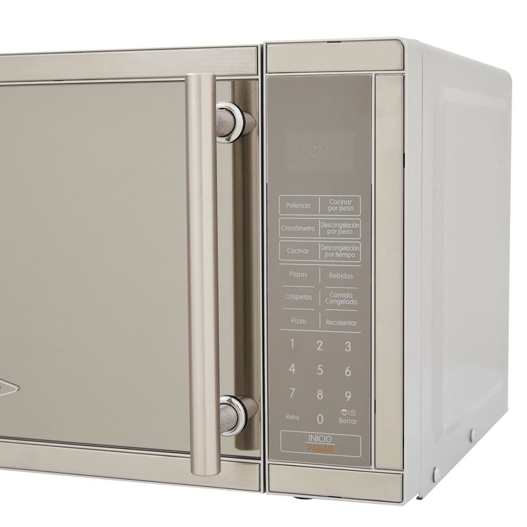 Microondas en acero inoxidable de 20 litros con vidrio reflectivo y manija integrada que complementan su diseño. Con su función multietapa puedes programar en un solo instante descongelar y cocinar tus alimentos por un tiempo determinado. Además sus funciones predeterminadas agilizan la preparación de tus recetas favoritas.