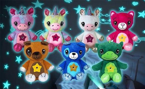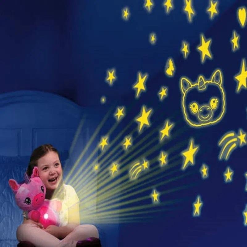 Convierta la habitación de sus niños en noche de cielo estrellado Es un muñeco de juguete suave y cómodo, que proyecta en paredes y techos, figuras lindas, brillantes y divertidas que se reflejan en la oscuridad con solo oprimir su barriga.