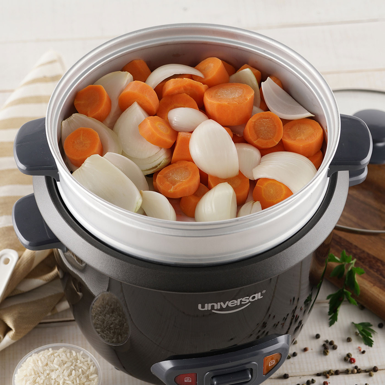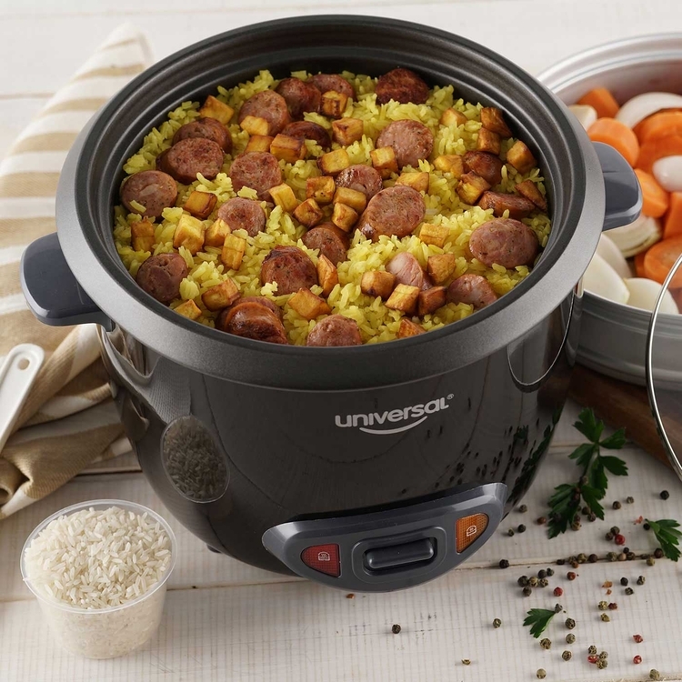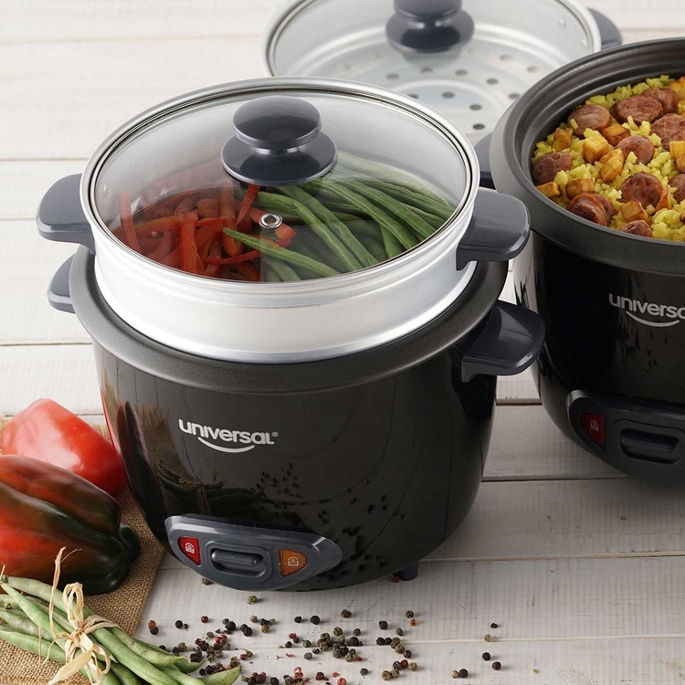 Olla arrocera con vaporera 2 libras Negra Universal viene con medidor y cuchara plástica. Garantía de 2 años.