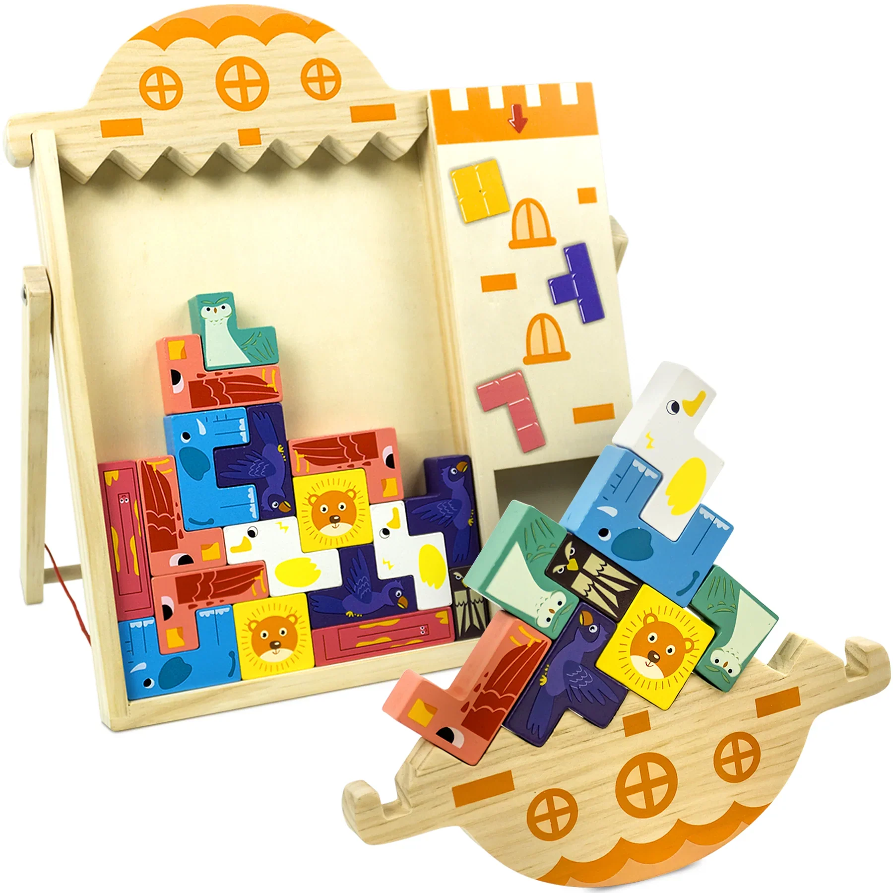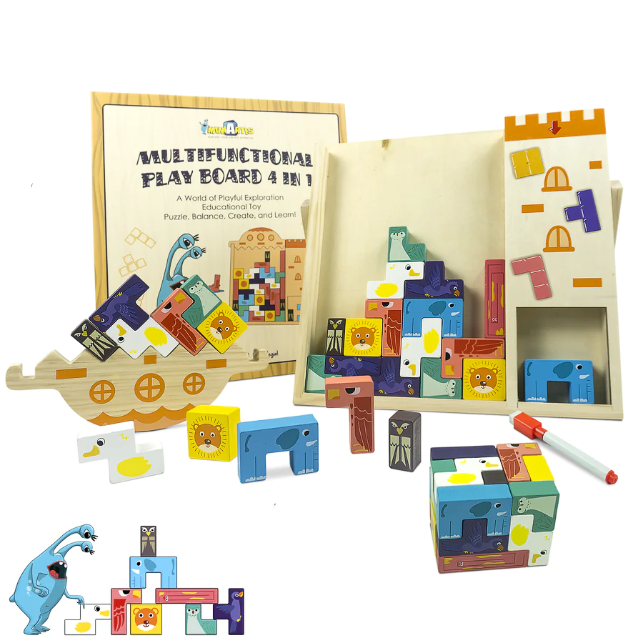 Tablero en madera con 36 piezas con cuatro opciones de entretenimiento, los pequeños pueden armar cubos, jugar al tradicional tetris, hacer dibujos en el respaldo en un tablero de marcadores borrables, o desmontar la parte superior y jugar en con el barco haciendo torres de equilibrio.